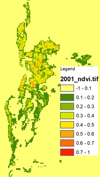 19. The Normalized Difference Vegetation Index is a well-documented method of deriving a vegetation index by using the red and infrared channels in a multispectral image to create the index. Once atmospherically corrected; the NDVI equation can be can be performed on the imagery. The results are between 0 and 1. Values of 1 indicate the maximum possible amount of vegetation (i.e. rainforest) and 0 indicates desert.