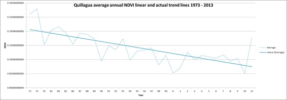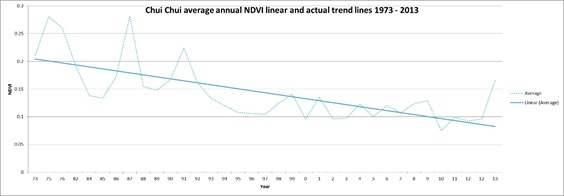2. Jim Norton (GISCorps) will perform NDVI (Normalized Difference Vegetation Index) using any available Landsat sensor imagery for as long a time period as is possible of two locations in the Atacama region of Chile (Quillagua: 21°39’11.44″S 69°32’22.01″W and Chiu Chiu: 22°20’47.80″S 68°38’48.99″W) within 20 hours in June 2013 (a time frame designated by GISCorps briefing document found at Annex A (GISCorps Partner Agency Form) in order to aid in the identification of vegetation health and decrease.