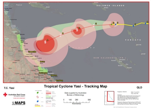 The 35+ MAPS personnel created many maps and products including those displayed on this page and ensured the success of the project. According to Tim McInerny: “During the QLD Floods and Cyclones of 2011, the preparation undertaken by the GISCorps team allowed for a smooth transition to the MAPS teams that were deployed to assist the Red Cross Incident Management Team. Overall, 37 MAPS team members were deployed over 47 days and hundreds of spatial products were developed to assist the operation.