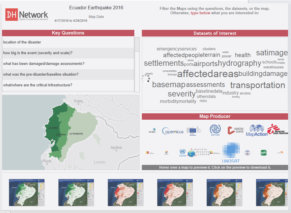 To operationalise all this work, the Decision Makers Needs Community of Interest produced this Map Filter for the emergency in Ecuador, based on the key questions identified above. It allows people to filter maps based the questions they need the map to help answer, the key datasets they need to see on the maps, and the date of production of the map. The Map Filter was designed and continually updated by a volunteer from the Tableau Service Corps. For the filter to work, it was vital to have people with experience in map interpretation to classify the maps based on potential map use. This map classification was done by 5 volunteers from GISCorps – it required monitoring maps posted to ReliefWeb and then creating detailed map metadata that could then be used in the map filter. Having GISCorps volunteers from across the globe meant that the filter was able to be continually updated around the clock during the first few weeks of the response.