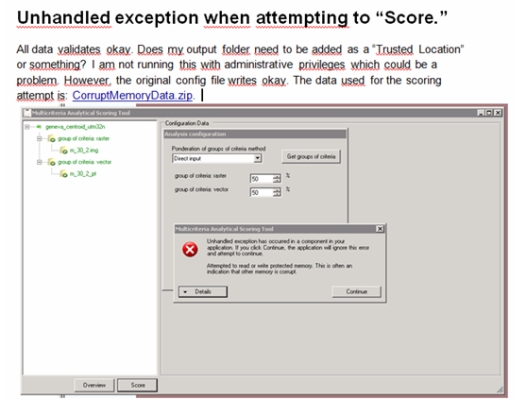 GISCorps volunteers deployed to this project were: Benjamin Koziol from Michigan, Curtis Day from Oregon, and Robert Cheetham from Pennsylvania. They did an excellent job in testing of the MASCOT tool which took one month. Several important bugs were reported and numerous suggestions of improvements were given by the volunteers. All reported comments were taken into account and permitted to continue the development work. The next stage of the project will be testing the application in a mine affected country before the final deployment of the MASCOT scoring tool.