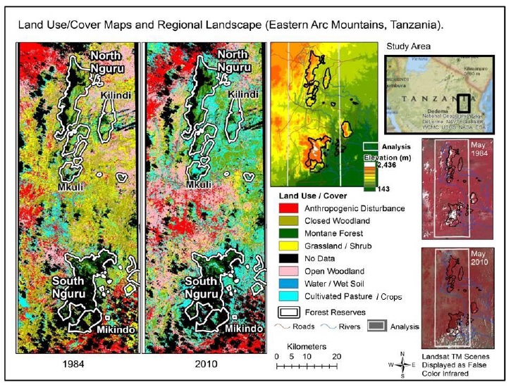 Landsat TM satellite images from 1984 and 2010 were selected to assess changes in land use and land cover across the years. The approximated area of interest was 10,500 square kilometers in areas surrounding Nguru Forest Reserves in the Eastern Arc Mountains of Tanzania. Landsat images on the USGS Glovis website (http://glovis.usgs.gov/) for the fewest cloud cover in the growing season of May and June. ERDAS IMAGINE 2011 was used to minimize haze in the images. Clouds and their shadows were masked out of the analysis by assigning no data values (zero) to these classes after using a supervised classification to aid in the delineation process. A cloud-effects mask which was merged from both images was applied to the change detection analysis. Examples of land cover categories were selected to train the supervised classification to identify spectral signatures and associate them with a specific user-defined category. Topographic maps for 1970s were also used in identification of land cover such as crops or plantations, grasslands, and forests. Elevation from digital elevation models (DEM 30m) aided decisions regarding montane forest locations. We equally used Google Earth software and the compiled satellite imagery to select land cover types. Within ERDAS IMAGINE, band combination 5 (short-wave infrared), 4 (near infrared), 1 (blue) were used in the R, G, B color guns to help distinguish between vegetation categories.