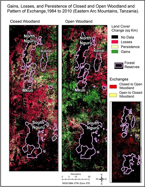 Land use/cover which has undergone losses include: montane forest, closed woodland and grassland/shrub (figure 4). The area between North Nguru and Kilindi and south to Rudewa Forest Reserves transitioned primarily from grassland/shrub and closed woodlands into cultivated pasture and open woodlands (figure 2). There is association between anthropogenic expansion in the landscape and greater expansion of open woodland based on their distribution in the landscape between the two years of imagery. The area of open woodland may be the result of the opening up of closed woodland by anthropogenic disturbances such as village, farm and pasture development. As populations became denser and urban areas grew to fill in lowlands, perhaps native grasslands were converted to agriculture and pasture.