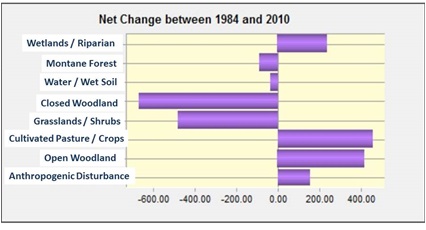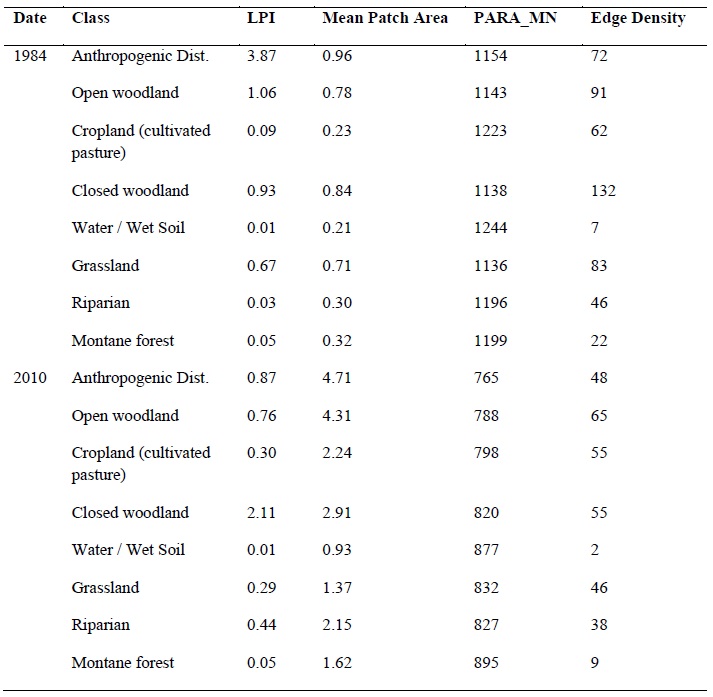 Fragmentation metrics illustrate a landscape that is undergoing fragmentation. Change in patch area, edge density and PARA is seen in montane forest from 0.32 in 1984 to 1.61 in 2010.