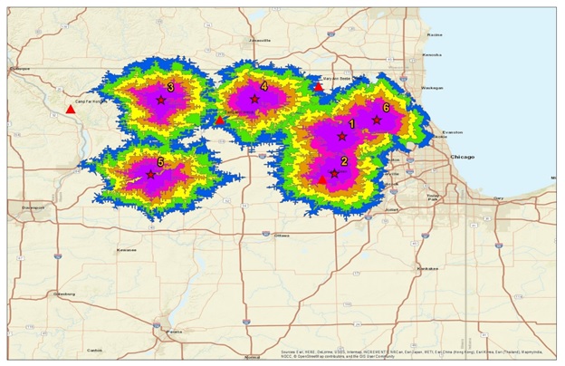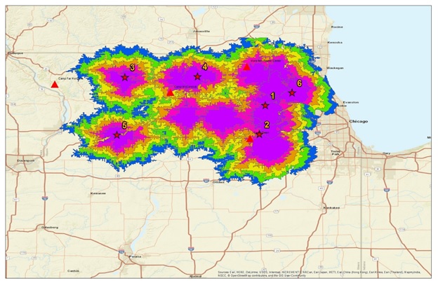 6. The same drive time analysis was completed for the camp locations, using 10 minute intervals beginning at 40 minutes and ending at 90 minutes. This analysis and mapping showed where there were current members who could not get to a camp within those timeframes. An hour was a good middle ground for visual analysis. Completing a GAP analysis for the camps we were able to see where future facilities should be looked at as well. The analysis for the camp locations was not part of the initial project, but was a simple addition within the scope.