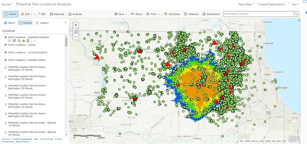 4. The next step was to run a network analysis to determine which existing sites members were closest to. This gave the team a base to look at for new locations. The average driving time to a location and to camps was calculated, as well as numbers of members who were closest to any one existing location and camp. The results were documented in a spreadsheet and map layers.