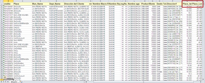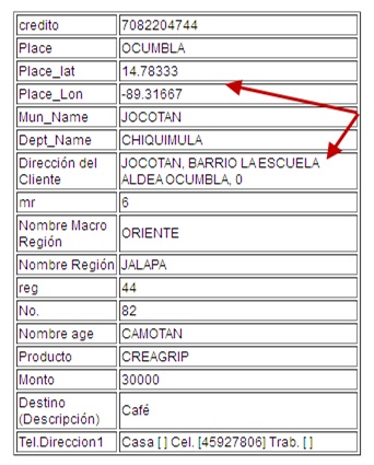 The solution provided was to design an open-source GeoKettle automated script,. This script receives the descriptive information, in Excel format about the location of the client including department, municipality, and in many cases village or neighbourhood; this information is not easily and directly convertible into location information as the system of addresses in Guatemala is relatively informal. In addition, the database contained data input anomalies and other inconsistencies which needed to be corrected automatically. The script then matches these locations with the addresses documented in GeoNames.org, then exports the results of the point geometry locations output into KML and Excel formats.