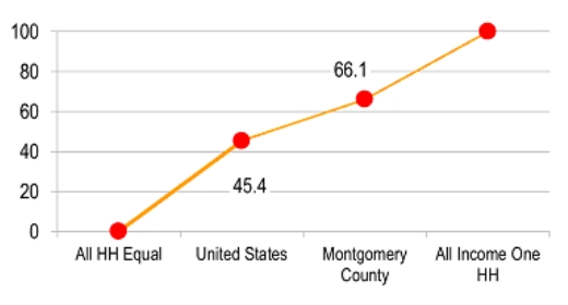 Montgomery County is very diverse in many ways, ranging from urban to rural areas, and its demographics reflect this diversity. Only 4.3% of the county is under the national poverty line, compared to 14.3% for the United States. The Gini coefficient statistic is a standard measure of income inequality and ranges from 0 for absolute equality to 100 where one household has all the income. Using household income from the Census Bureau’s 2007-2009 American Community Survey, we find that the coefficient for Montgomery County is 66.1 and is much higher than the national coefficient of 45.4. Thus there is a high degree of household income inequality in the county.