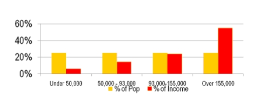 53% of all county income is earned by the top quarter, the bottom quarter earn only 6%
