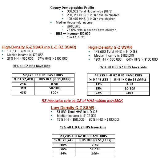 The high school clusters are not completely aligned with the block groups, so proportional aggregation was used to produce estimates. Therefore, the demographics were not as flexible in providing the breaks desired (e.g., how many owned households with children and had an income under $50,000 within each SCC).