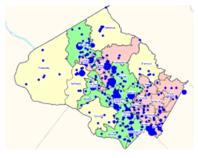 This project demonstrates how Montgomery County can identify and mitigate social injustices occurring within their boundaries. The four components to the project are: 1) identify community-level economic elements affecting lower income families, 2) design an analytical framework to understand community and income-based economic conditions, 3) apply the framework to analyze conditions in Montgomery County, and 4) recommend policies and actions for mitigating adverse effects.As a first step, it was important to understand what data were available, which, as experienced GIS professionals know, can be the most time-consuming project task. Finding consistent data that identify community-level economic elements affecting lower income families is a cumbersome task. The Montgomery County School Board provided the shape files of their school catchment zones as well as school locations. The Nielsen Company provided demographics at a block group level (gratis) so the data could be aggregated to the high school clusters (see map). County level budget data and locations were provided by county agencies and aggregated to the same level. Other data were reviewed and are either in the process of being incorporated or have been ruled out due to the inability to measure across school zones.