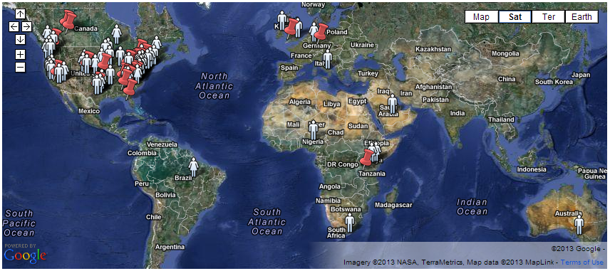 Locations of active and retired volunteers (pushpins are retired volunteers)