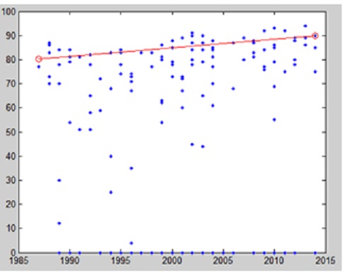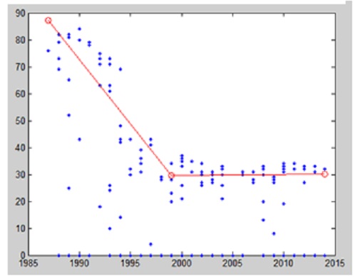 • The basis for the chosen algorithm is Matlab code called Shape Language Modeling (SLM) which was written by John D’Errico. This code makes use of non-linear optimization to simultaneously estimate the dates of a state change (e.g., change from stability to decline) as well as the associated NDVI value at that point. Figure 4 shows the result of this code visually using the red line for ADA disturbance. Figure 5 shows the single line for undisturbed forest. Figure 6 shows the process of urbanization. This is different from the ADA disturbance because it is more gradual (i.e., the slope of the red line is not as steep).