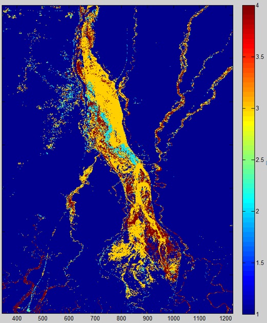• We ran this code for all 2.6 million pixels in the study area. This is very processing intensive and could literally take a month to run on a single processor. Luckily, many folks in the remote sensing community have access to some kind of multicore server. For this analysis, we used 32 processors in parallel and completed the study area in approximately 1.5 days.