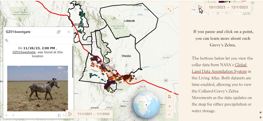 With the species, goals, and places established, the reader can then explore time-enabled data that makes Grevy’s zebra ecology tangible. We have a map and a companion Web Experience to show movement from twenty collared animals beginning in September 2023, letting visitors watch seasonal shifts and compare behaviors across individuals or time. Alongside collar data, a time-enabled sightings map adds human observations, and revealing presence patterns that complement the movement story. Because water shapes both pastoral and wildlife decisions, we layered in precipitation and water-storage context so readers can connect hydrology with where and when Grevy’s zebras choose to be on the landscape.