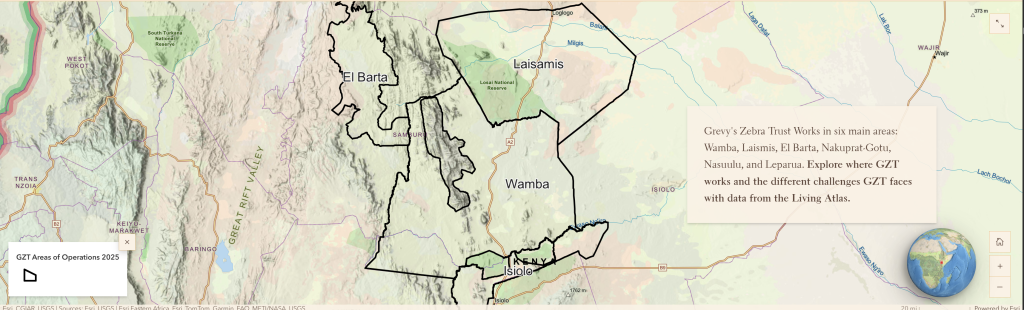 This project focused on building a public-facing ArcGIS Story Map for the Grevy’s Zebra Trust (GZT) rangelands program while strengthening GIS workflows, so program data becomes easier to update, explore, and share. From the outset, the goal was in two folds: to craft an engaging, museum-like narrative experience, and to integrate practical GIS elements – maps, apps and spatial techniques – that help the data work harder and remain accessible to staff and partners.