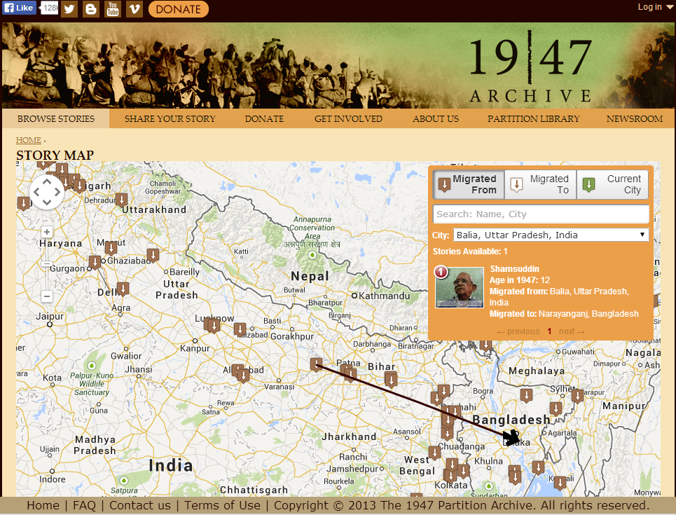We have begun to put a subset of the recorded stories in a map for each of visualization. The map is intended for interested viewers to graphically browse the locations of the witnesses, their migrations, and their current residences. The map also allows for browsing of the photos and videos, along with a short description for every user. Details can be found here: http://www.1947partitionarchive.org/browse.