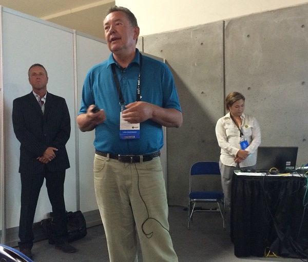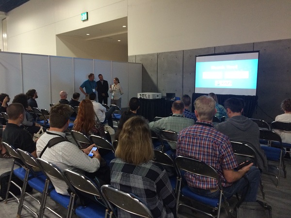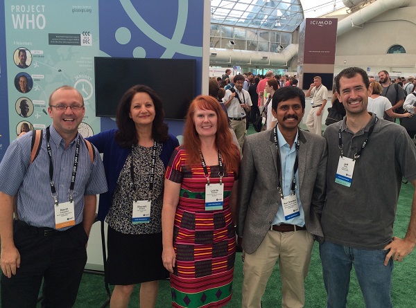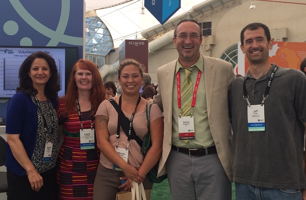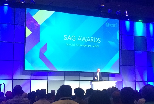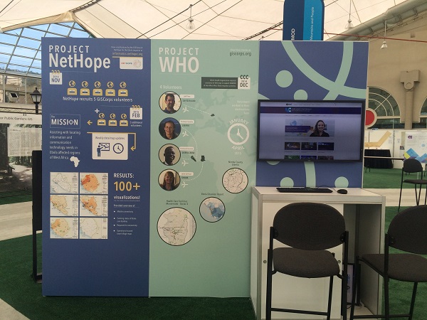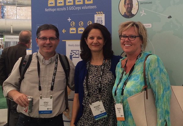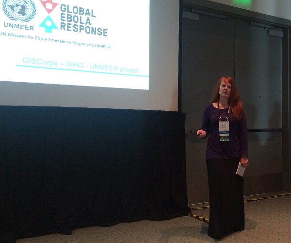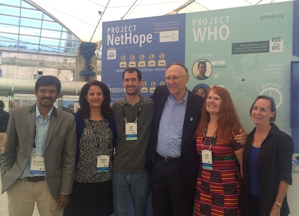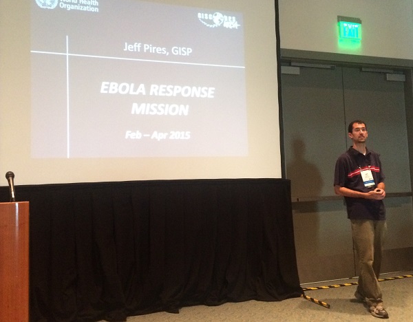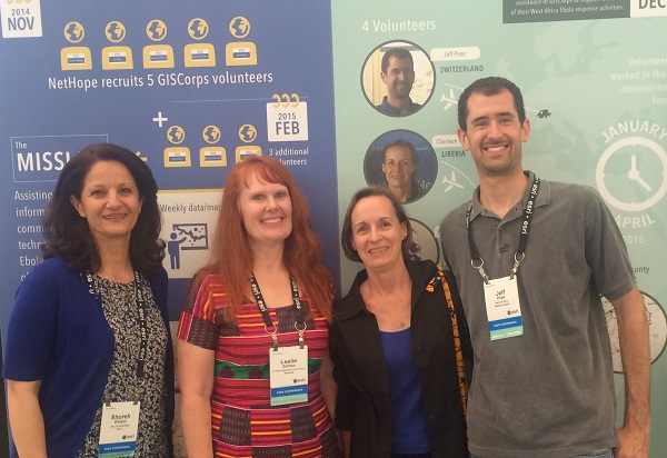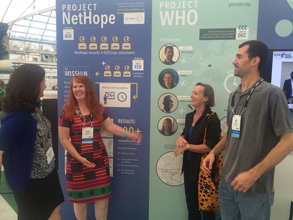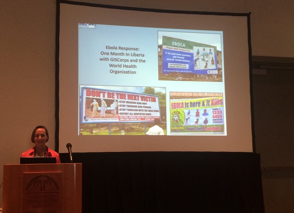 The 2015 ESRI User Conference was held in San Diego from July 20-24. As in the past several years, GISCorps had a special exhibit in the Map Gallery (under Ebola Response this time) where 100’s of existing and new volunteers stopped by and visited with the Core Committee (CC) members and other volunteers. Other activities included: presentation with Melodie Grubbs (GISCorps volunteer) and NetHope’s Frank Schott and Joel Myhre on Tuesday, received Esri’s Special Achievement Award (SAG) on Wednesday, and finally, the CC members and WHO volunteers presented at the annual session on Thursday. The following photos were taken during the week at those events.