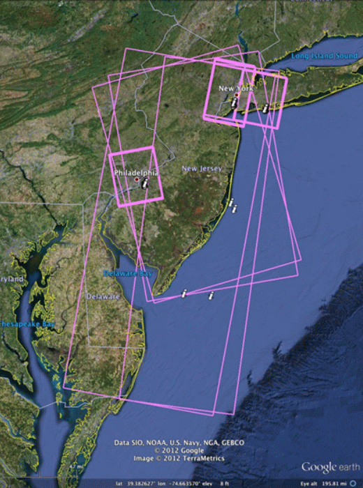 Figure 1. Swath footprints of COSMO-SkyMed data acquisition following the landfall of Superstorm Sandy