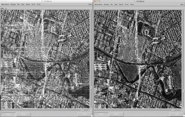 Within the frame there are red pixels and transparent pixels. The red pixels represent the top 0.8% anomalous changes during the time period of October 22, 2012 – November 3, 2012 compared to the time period of October 18, 2012 – October 22, 2012. The data were provided in single-look SAR image format by the Italian Space Agency. We used the ROI_PAC, the InSAR software package developed at JPL/Caltech [15] for InSAR processing and the damage proxy map algorithm developed at ARIA project at JPL/Caltech [9]. The top 0.8%, or 99.2 percentile, threshold was selected when red pixels started showing up on the sea surface, as we decreased the threshold.