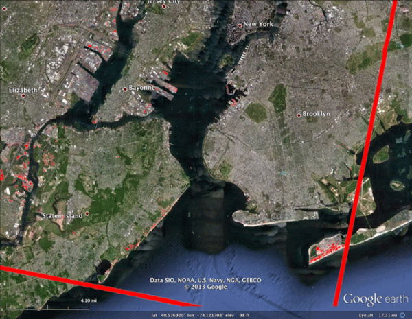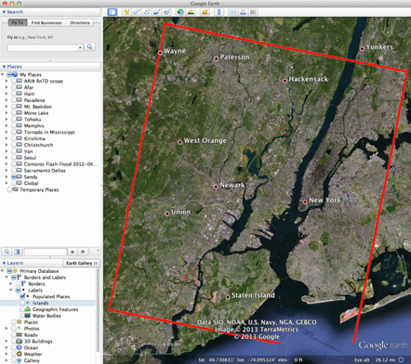 Figure 5. WorldView-1 image of New York City mosaicked and overlaid on Google Earth. The red boundary indicates the extent of the mosaicked image.