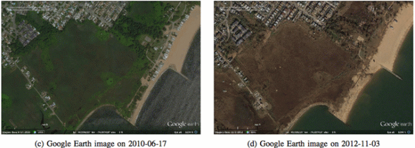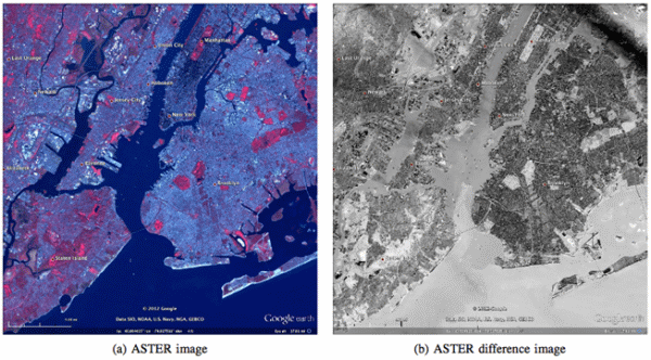We first tried using the Advanced Spaceborne Thermal Emission and Reflection (ASTER) visible to near IR images (nominally at 15 m posting) that were acquired from the Terra satellite on 2011-09-01 (pre-Sandy) and 2012-11-04 (post-Sandy, see Figure 4a). The one-year separation was chosen to get as close to the same lighting conditions as possible. The images were converted from UTM to lat/lon projection and then truncated to make it easier to register to Google Earth. However, the resolution was too low to be useful for validation. A simple difference of the pre- and post-Sandy images did not produce useful signal for damage detection (Figure 4b).