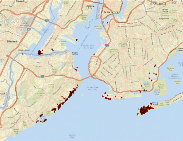 The blowup of the southern part of Figure 2 is shown in Figure 3. Although ARIA’s damage proxy map algorithm can produce a pixel value of full floating point range of [-1 1] or [0 1], this damage proxy map has binary pixel values – either zero or one, to keep the validation process simple. The damage pixels are distributed along the coastline in Staten Island, Brooklyn, and Breezy Point. There are other groups of red pixels along the water and on the docks at harbors, where human activities are expected to have caused changes significant enough to be detected (See Figure 7).