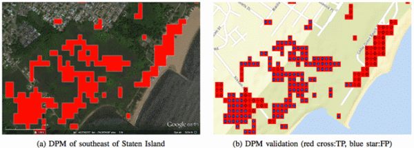 The true positives from our validation are shown in Figure 6. The total number of red pixels in the DPM is 13,723 and the number of confirmed damage pixels is 1,139, about 8.3% of the DPM pixels. Each red cross represents the location of the red pixel in the damage proxy map that was validated to be correct detection. The size of the red crosses is much bigger than the size of the red pixels for visibility. Figure 7a shows the DPM of southeastern part of Staten Island, and Figure 7b shows the validation task results. The red cross marked on top of the red pixels mean correct detection, and the blue stars on the red pixels represent false positives. The group of red pixels in the right-hand-side of Figure 7a indicates severe damage on the houses. In fact, along the coast near Cedar Grove Avenue, almost all the houses were swept away, which can be confirmed in Figure 7c and 7d.