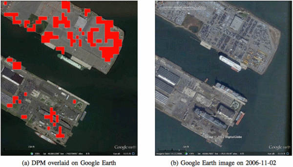 The second type is human activities that do not involve structure damage. For example, the distribution of cars at parking lots change every day. The distributions of merchandise containers and ships on and around the docks at harbors change on daily basis as well. This type of change appears as change in the recorded radar echo because of the difference in the way the radar signal reflects from the different configuration of objects. For example, the two parallel docks in the city of Bayonne produced a number of red pixels in the damage proxy map (Figure 8a), but we confirmed that most of the signal is due to the change in the objects placed on the docks as can be seen in Figure 8b-8d. Although we did not track false negatives, we saw occasional false negatives through our work. For example, the houses at the upper right corner of the before image (Figure 7c) are gone in the after image (Figure 7d), but the red pixel group in the DPM did not stretch all the way up to the boundary.