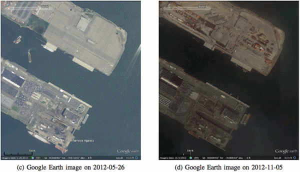 Figure 8. Damage proxy map and Google Earth images of the docks in the city of Bayonne, New Jersey (a littler upper left from the center of Figure 3). The changes on the dock by human activities produced the false positives.