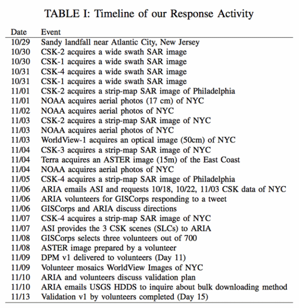 NOAA started acquiring aerial photographs from three days after Sandys landfall. NOAA flew aircrafts at about 1,500 m above the disaster areas, producing thousands of aerial photographs at about 17 cm resolution [10]. On Day 5, COSMO-SkyMed acquired the first post-event strip-map mode radar data over New York City. A week after the disaster, the ARIA team encountered a posting on the Twitter looking for volunteers to interpret SAR images. ARIA responded to the tweet and volunteered to offer SAR image interpretation service. This initiated conversation between ARIA and the GISCorps.