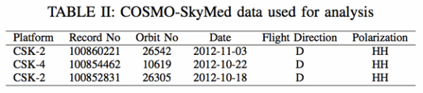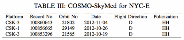 The eastern side of New York City was also imaged with an adjacent track of COSMO-SkyMed satellites as is summarized on Table III, and their swath footprint is indicated in Figure 1. However, we noticed that one of the SAR images was contaminated with radio frequency interference (RFI). Figure 10a is SAR image acquired on 2012-10-26 showing the RFI effect, whereas Figure 10b was acquired on 2012-11-04 and does not have as much RFI effect. We have requested raw data from ASI and are currently working on removing the RFI from the raw data.
