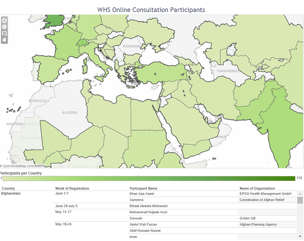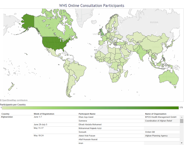 Katie assists OCHA officials with mapping participants signed up for updates via the WHS website. The OCHA officials use this information to target underserved areas to ensure maximum participation worldwide.